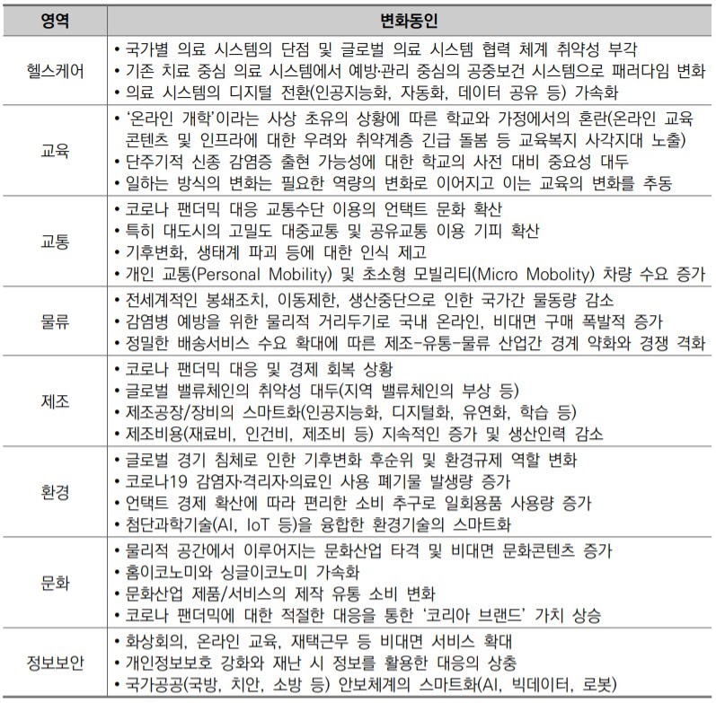 - 전문가 인터뷰 등을 통해 포스트 코로나 시대에서 우선적으로 고려해야 할 영역, 파급효과 및 유망기술을 도출함