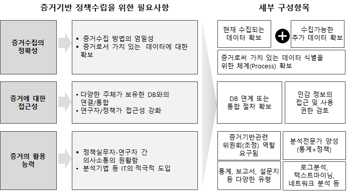 증거기반 정책 수립을 위해서는 다양한 사항이 필요하겠지만, 특히 1) 증거수집의 정확성, 2) 증거에 대한 접근성, 3) 증거의 활용 능력 등이 기본적이다.
