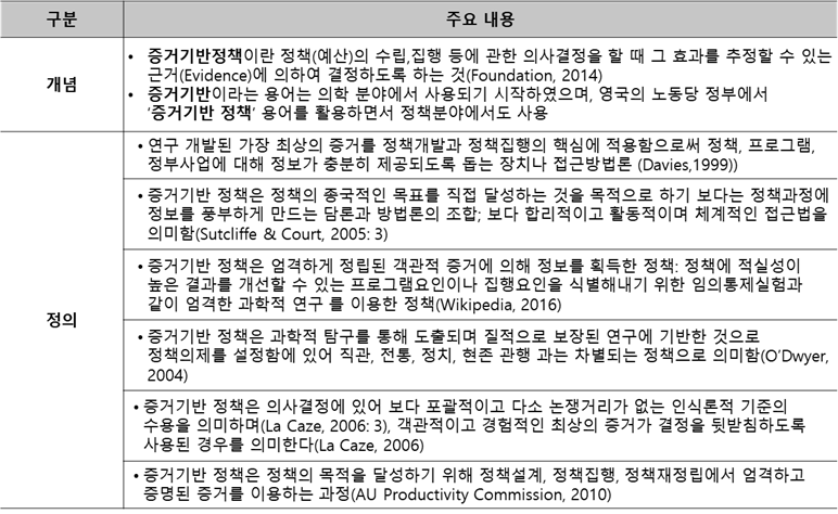 증거기반 정책은 정책(예산)의 수립, 집행 등에 관한 의사결정을 할 때 그 효과를 추정할 수 있는 근거(Evidence)에 의하여 결정하도록 하는 것(Foundation, 2014)을 의미하며, 다양한 논문에서 유사한 의미로 정의하고 있다.