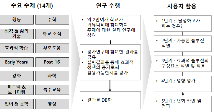 What Works Network는 건강, 교육, 범죄, 조기개입, 지역경제성장, 노인 삶의 질, 웰빙 등 7개 정책 분야를 대상으로 최상의 사용 가능한 증거를 확인함으로써 보다 나은 의사결정을 내리기 위한 목적으로 운영 중이다.